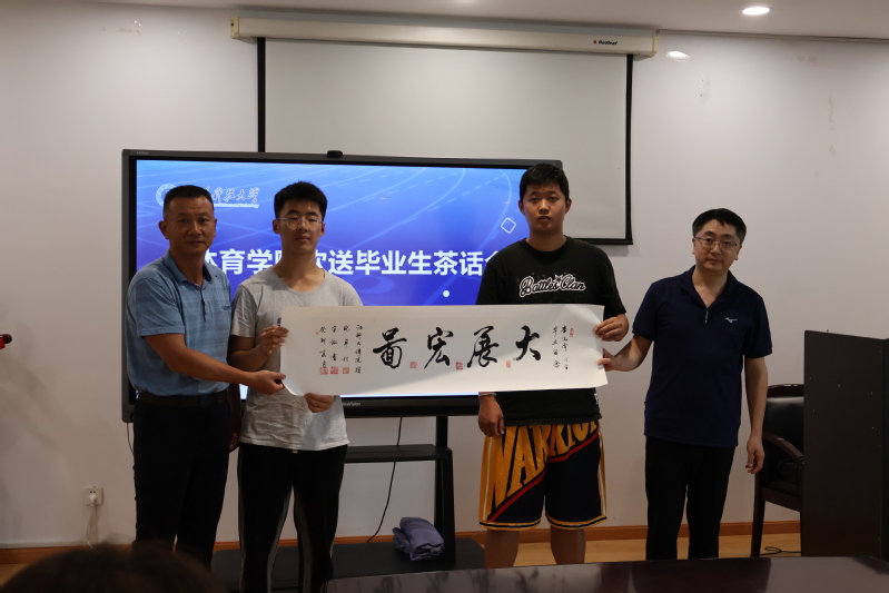 接下来2023届毕业学生与学院领导互送礼品,字画由魏晓卓院长题词、刘守嘏老教授亲笔书写,每位毕业生都得到了学院赠予的字画。紧接着保送上海大学的唐文杰同学、休闲体育班长丛琛作为毕业生代表进行发言,丛琛以饱满的热情、体育人的担当向在场的同学们寄予祝愿,希望大家牢记体育运动的宗旨:“更高、更快、更强”,做优秀的体育人。