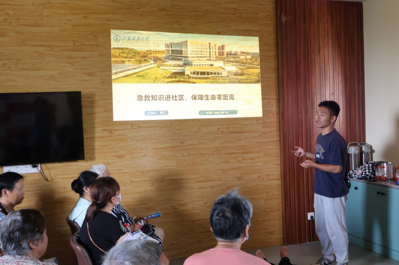 8月11号下午,实践团成员到达丹徒区西麓卫生服务站,团队成员先进行现场的布置。队长曾凡向大家讲解心肺复苏术和海姆利克急救法。同时利用讲解的知识进行实地操作,同时也邀请了听众们上来亲自体验操作过程。同时向居民们介绍普及日常生活中遇到呼吸道异物梗阻以及心跳呼吸骤停的情况时,居民朋友应该如何正确判断患者体征,并根据具体情况为患者实施准确急救。