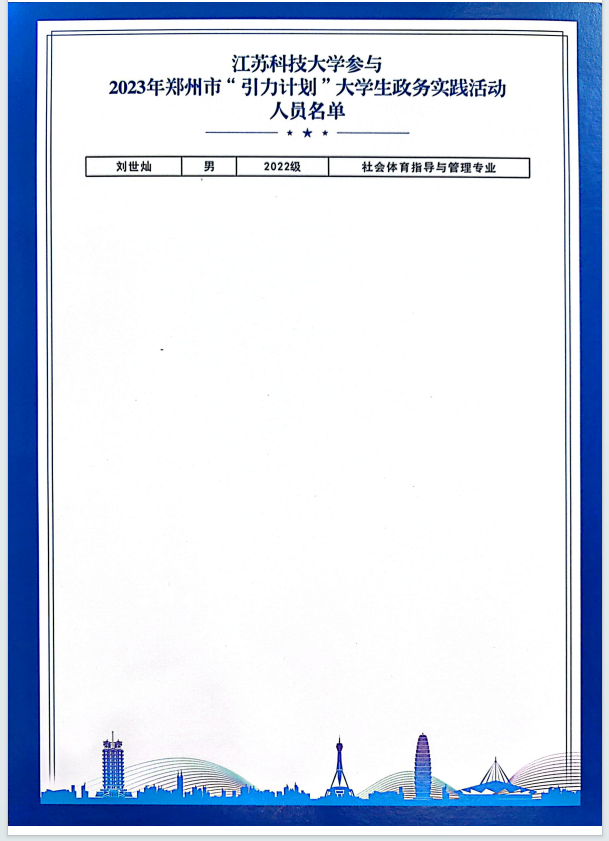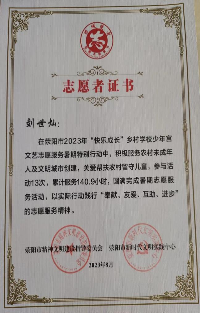 在本次政务参与实践活动中,刘世灿同学工作积极主动,学习认真,尊敬师长,待人诚恳,能够做到服从指挥,团结同事,并能够灵活运用自己的专业知识解决工作中遇到的实际困难,得到领导和同事们的一致好评。刘世灿同学被荥阳市精神文明建设指导委员会评为优秀志愿者,并收到共青团郑州市委员会发来的感谢信。