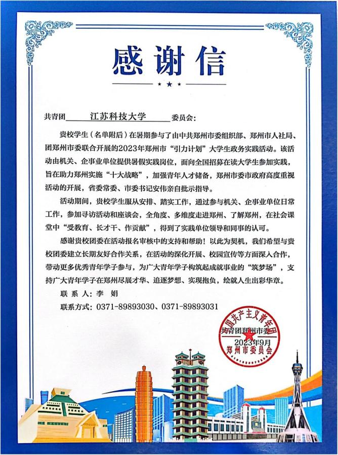 近日,我校团委收到了来自共青团郑州市委的一封感谢信,高度赞扬我校青年志愿者刘世灿同学积极响应参与郑州市“引力计划”政务实践活动,为我校在培养学生社会道德素养和奉献社会精神方面所作的贡献点赞。