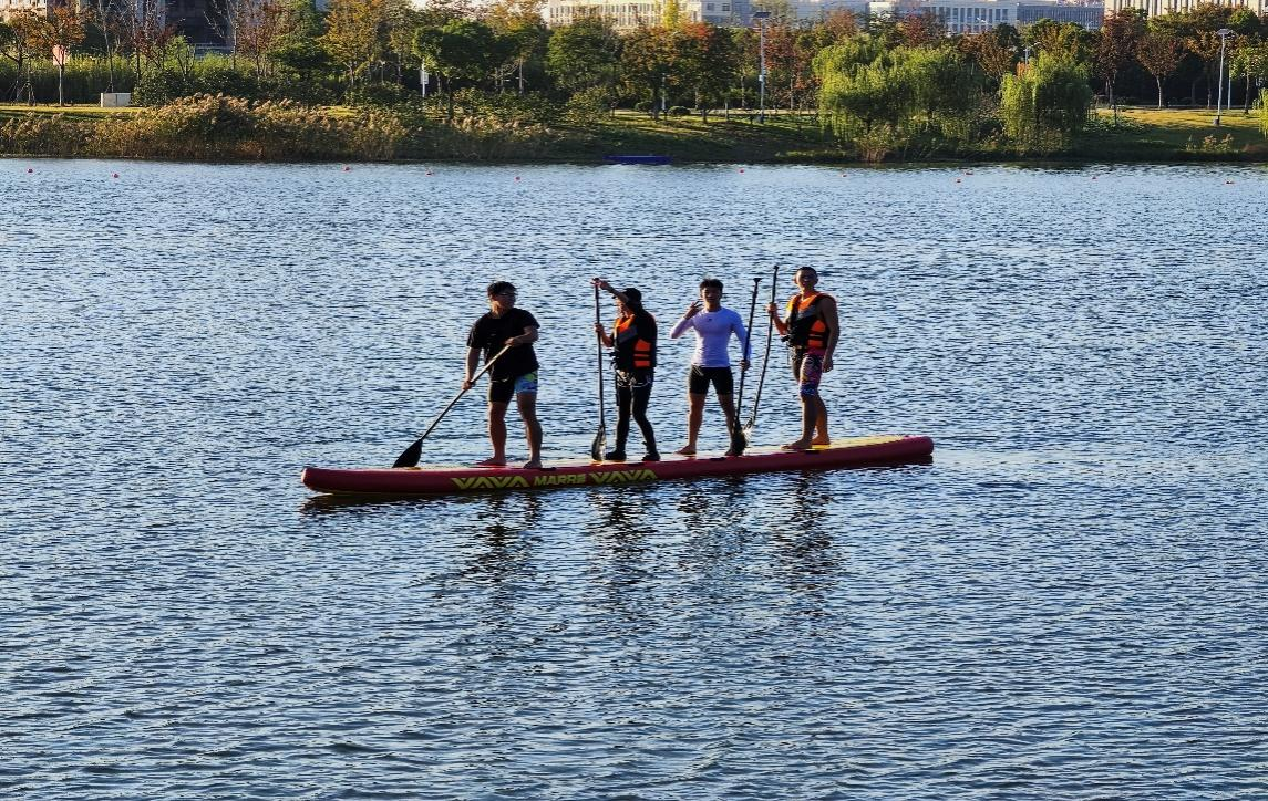 利用浆板学习形式,开展以“自信划桨,走向辉煌”为主题的浆板学习活动。通过“闭眼金鸡独立”“摸石过河”等小游戏,激励同学们积极探索未知事务中的平衡点。活动中,同学们积极尝试,刚开始总是会落水;但是,同学们的勇气丝毫未减,‘跌倒了,爬起来,继续前行’,充分展现了体育生敢于挑战未知,不轻言放弃的品质。掌握要领后,同学们以多种姿势,充分表达自己战胜未知困境后的喜悦心情。从困境中感受自我,帮助同学树立自信心和自豪感,坚信自己可以直面学习中遇到的压力,克服学习压力的方法,努力成就自己。
