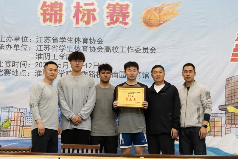 男子篮球队由张伟老师担任教练,队员分别是方懿(环化学院)、司马义·吐尔洪(生技学院)、潘守旸(材料学院)和康佳琪(船海学院)。小组赛中,四位队员不畏强敌、力挫群雄,以小组第一的成绩打入16强。决赛中,队员们积极拼抢、有勇有谋,最终荣获男子组第五名,这也是我校男子篮球队继2016年CUBAL二级联赛江苏基层赛后,时隔8年再次进入省级篮球赛事8强。