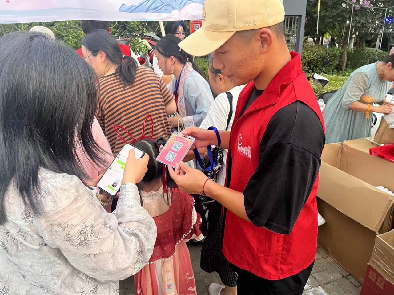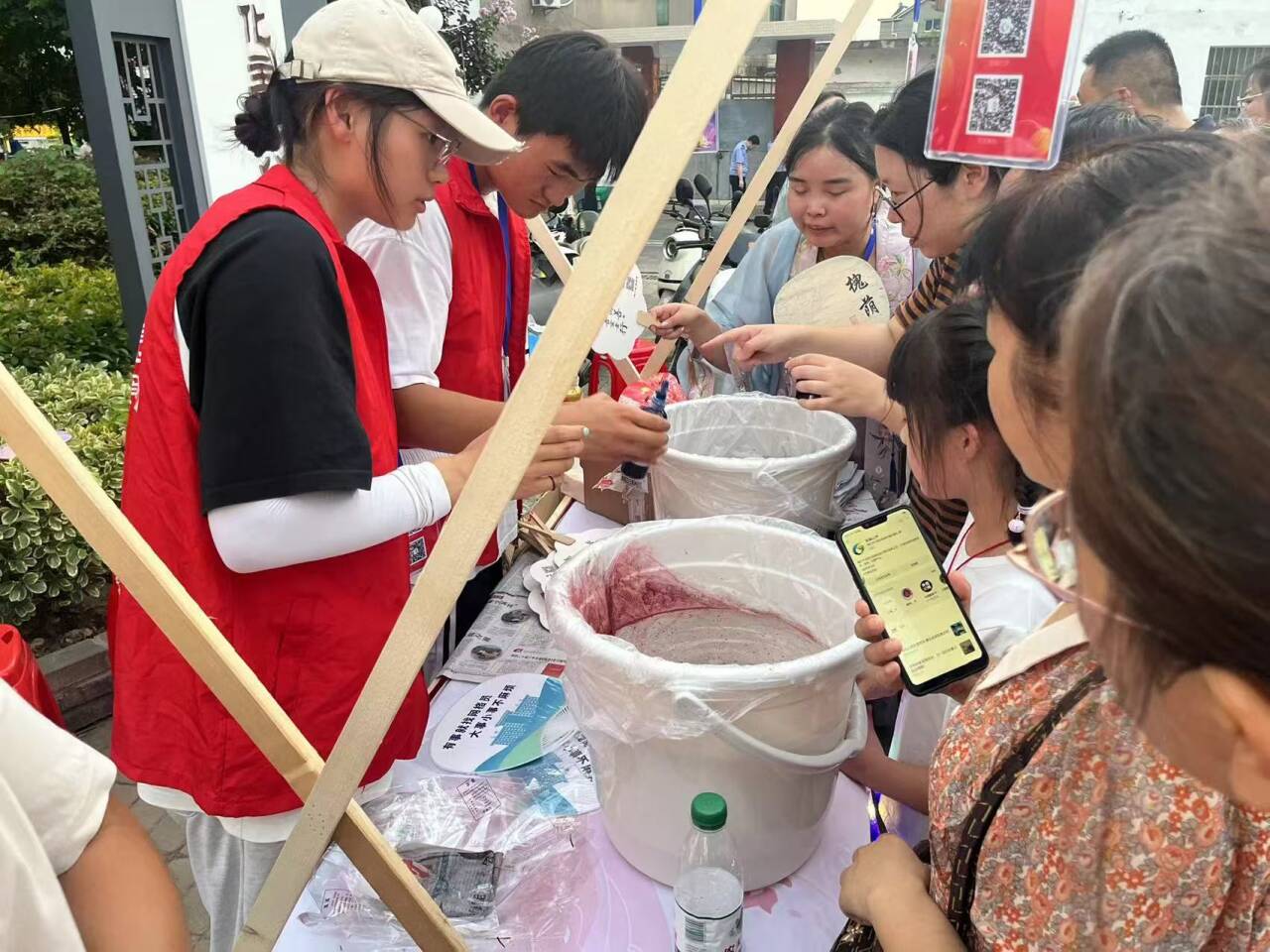 图为实践团成员让游客扫描二维码,宣传新婚俗文化