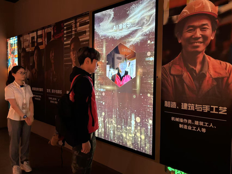 图为讲解员为匠心筑梦实践队成员介绍AI互动区。张诩曼 供图