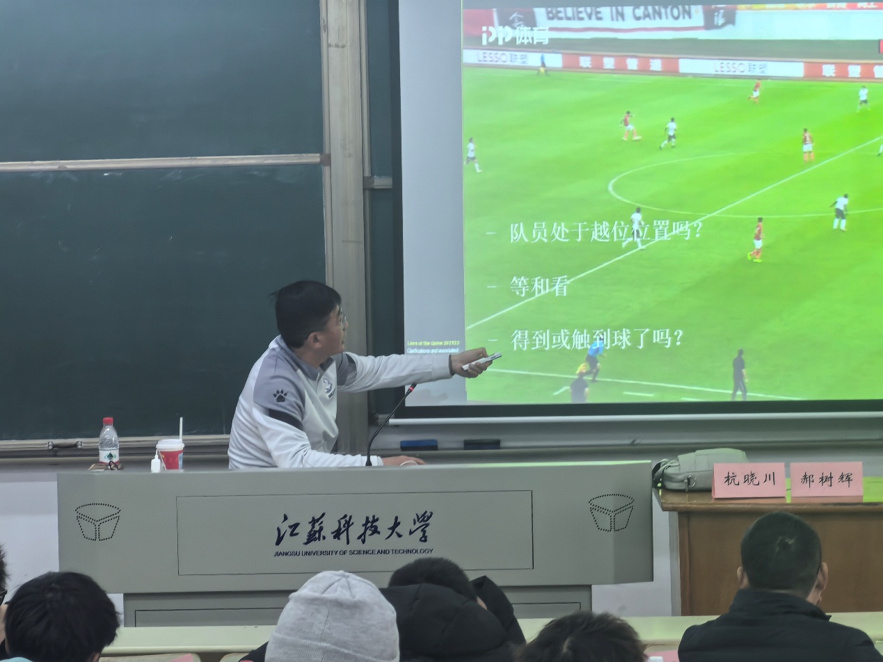 在裁判员能力提升路径部分,杭老师提出了“阶梯式培养+场景化实训”的核心思路。他强调,足球裁判培养需兼顾理论夯实与实践锤炼,从基础的规则背诵、手势规范训练,到高阶的临场预判、争议处理技巧,应构建模块化、系统化的培训体系。针对大型赛事的执法特点,他重点讲解了高强度对抗下的判罚尺度统一、关键场次的心理抗压训练、多裁判团队的协同执法流程等实用内容,为师生揭示了高水平赛事执法的“门道”。同时,杭老师着重强调了职业操守的重要性,指出裁判员的公正立场、严谨态度与责任意识,是守护足球运动核心价值的基石。